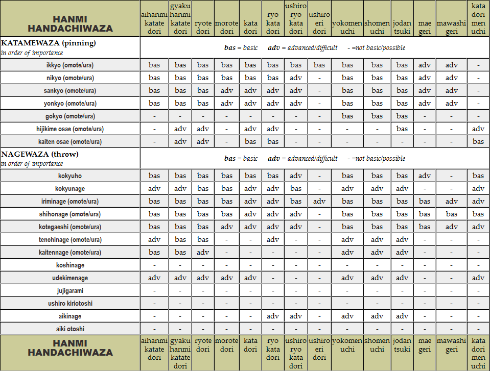 Hanmi handachiwaza: all attacks and aikido techniques. Click the image to see the table enlarged.