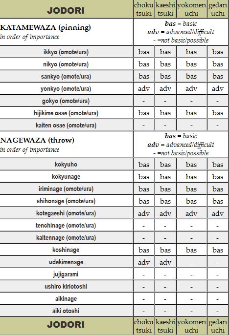 Jodori: all attacks and aikido techniques. Click the image to see the table enlarged.