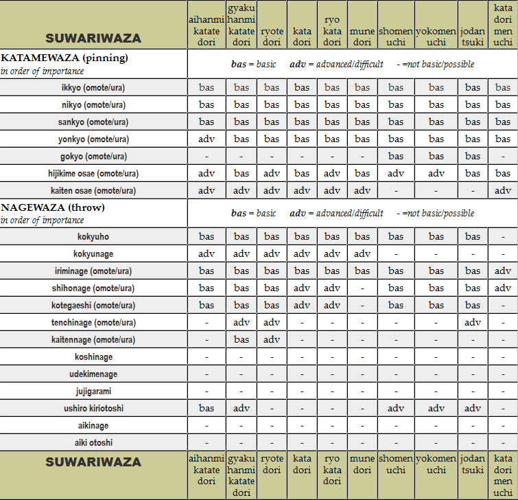 Suwariwaza: all attacks and aikido techniques. Click the image to see the table enlarged.