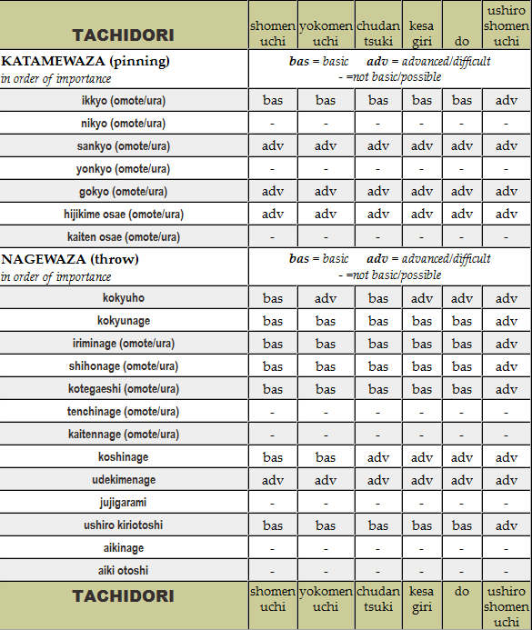 Tachidori: all attacks and aikido techniques. Click the image to see the table enlarged.