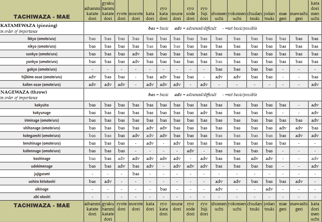 Tachiwaza mae: all attacks and aikido techniques. Click the image to see the table enlarged.