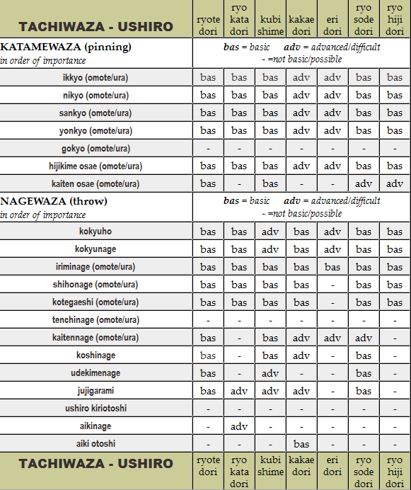 Tachiwaza ushiro: all attacks and aikido techniques. Click the image to see the table enlarged.