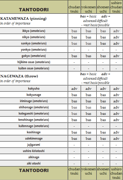 Tantodori: all attacks and aikido techniques. Click the image to see the table enlarged.