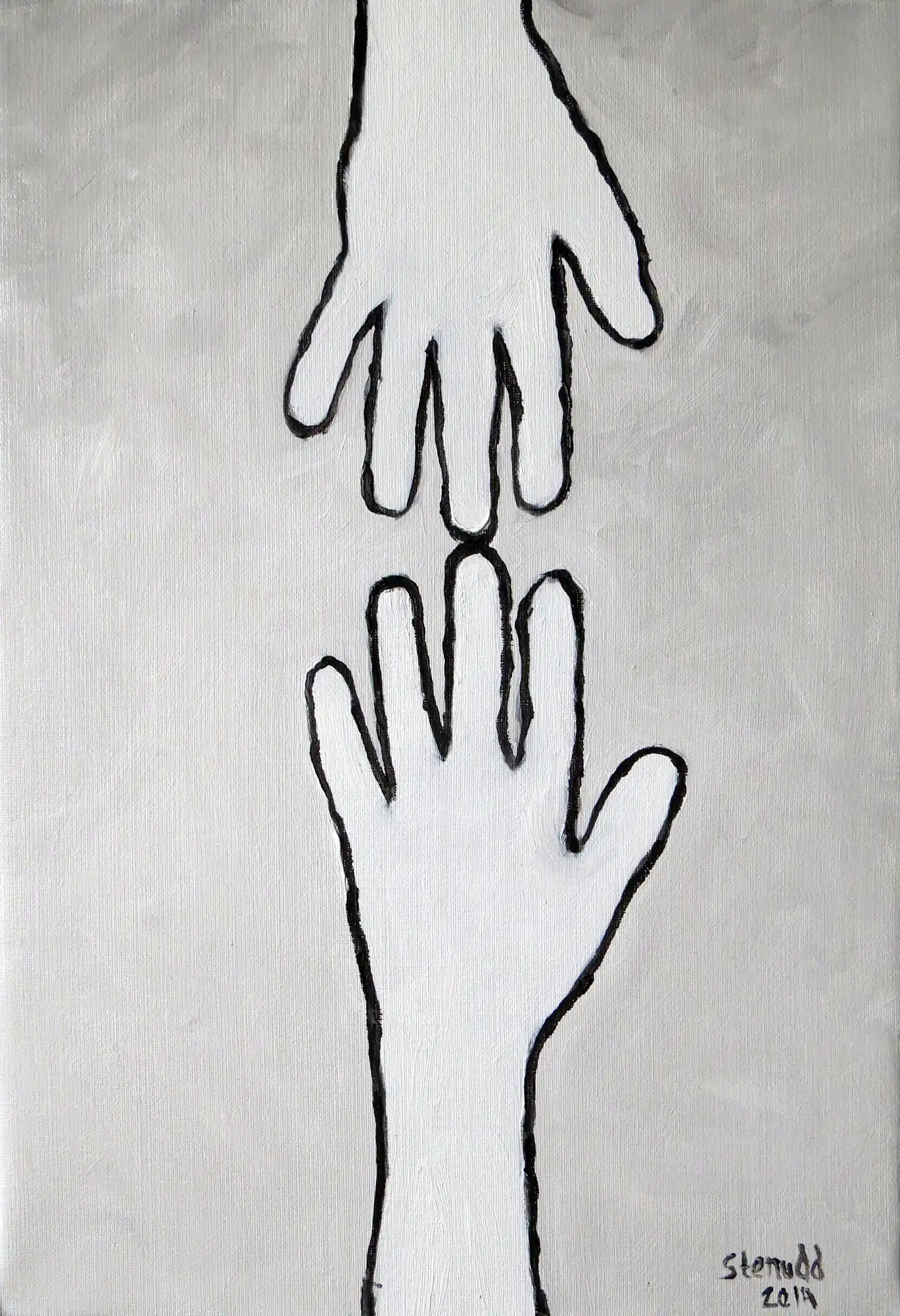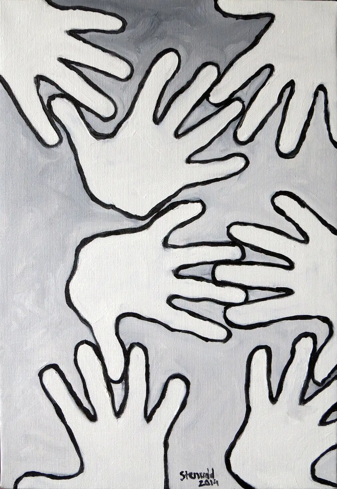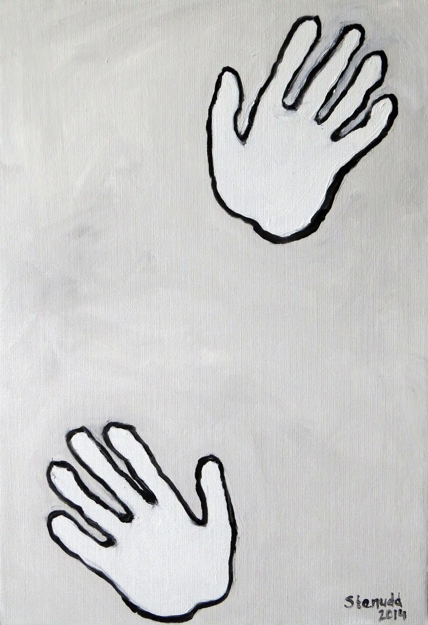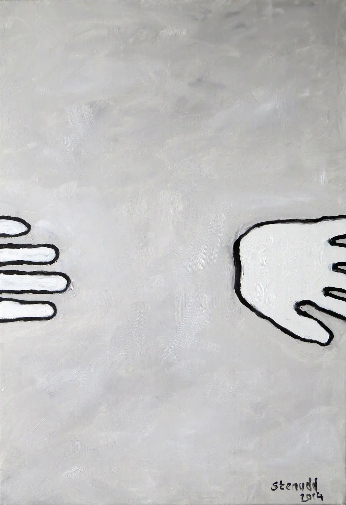 Hands On![]() 2014 Oil Paintings by Stefan StenuddSuddenly I Paint AgainIn July 2014 I picked up the brush and got started, inspired by a local Picasso exhibition, and I got at it with a frenzy. More than one painting per day. We will see how long I keep it up, but so far it's a pure joy. I experiment with black and white well, one black and two different whites. I keep it close to drawing, just to see what happens. It's also kind of a warm up. Colors will come, surely. I call these paintings Hands On, for obvious reasons. On an impulse, I traced my own hand on the canvas, and one idea was followed by another. I've already deviated a bit from this theme, as you can see further down this webpage. The hands remain, but they are not alone.
