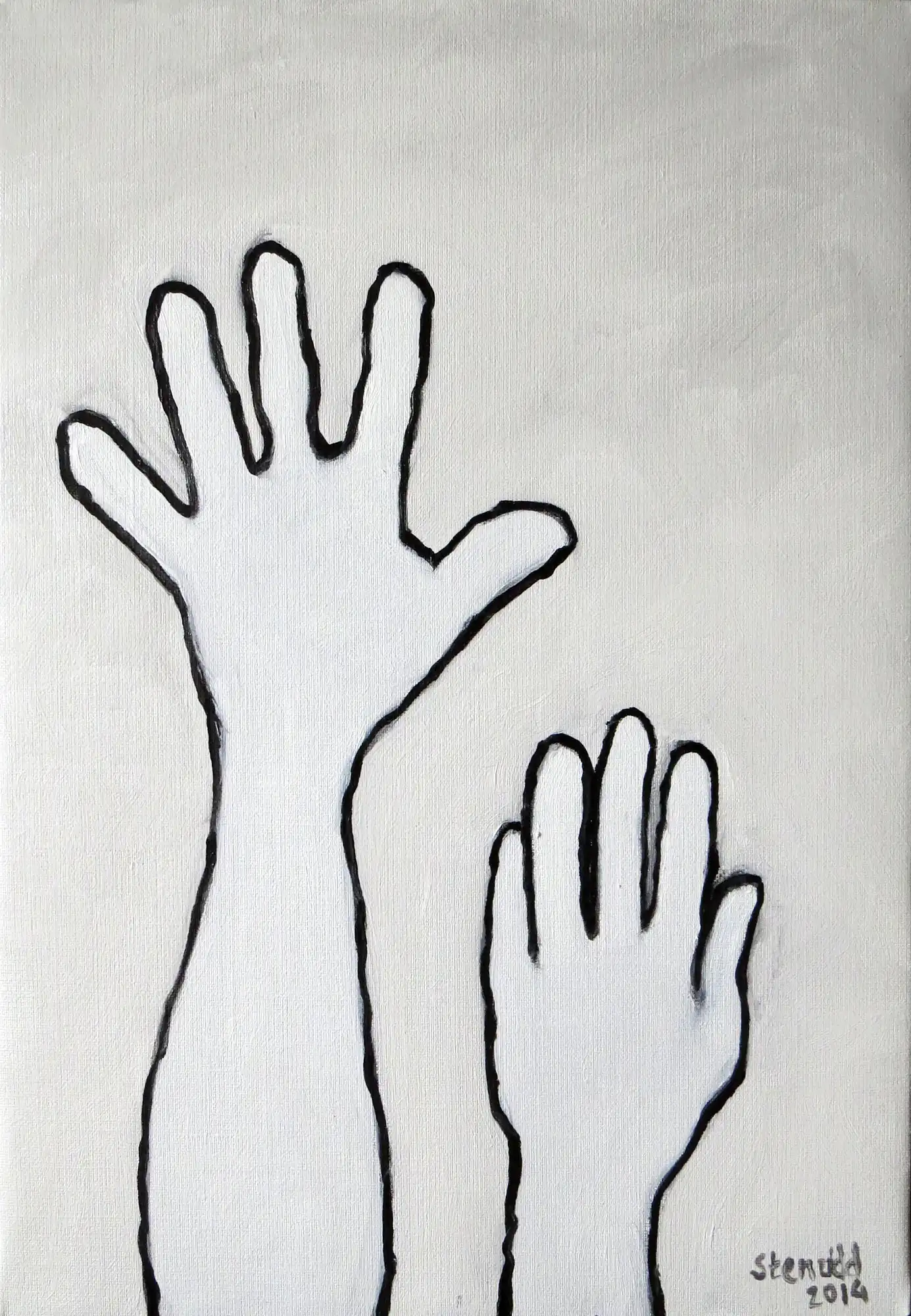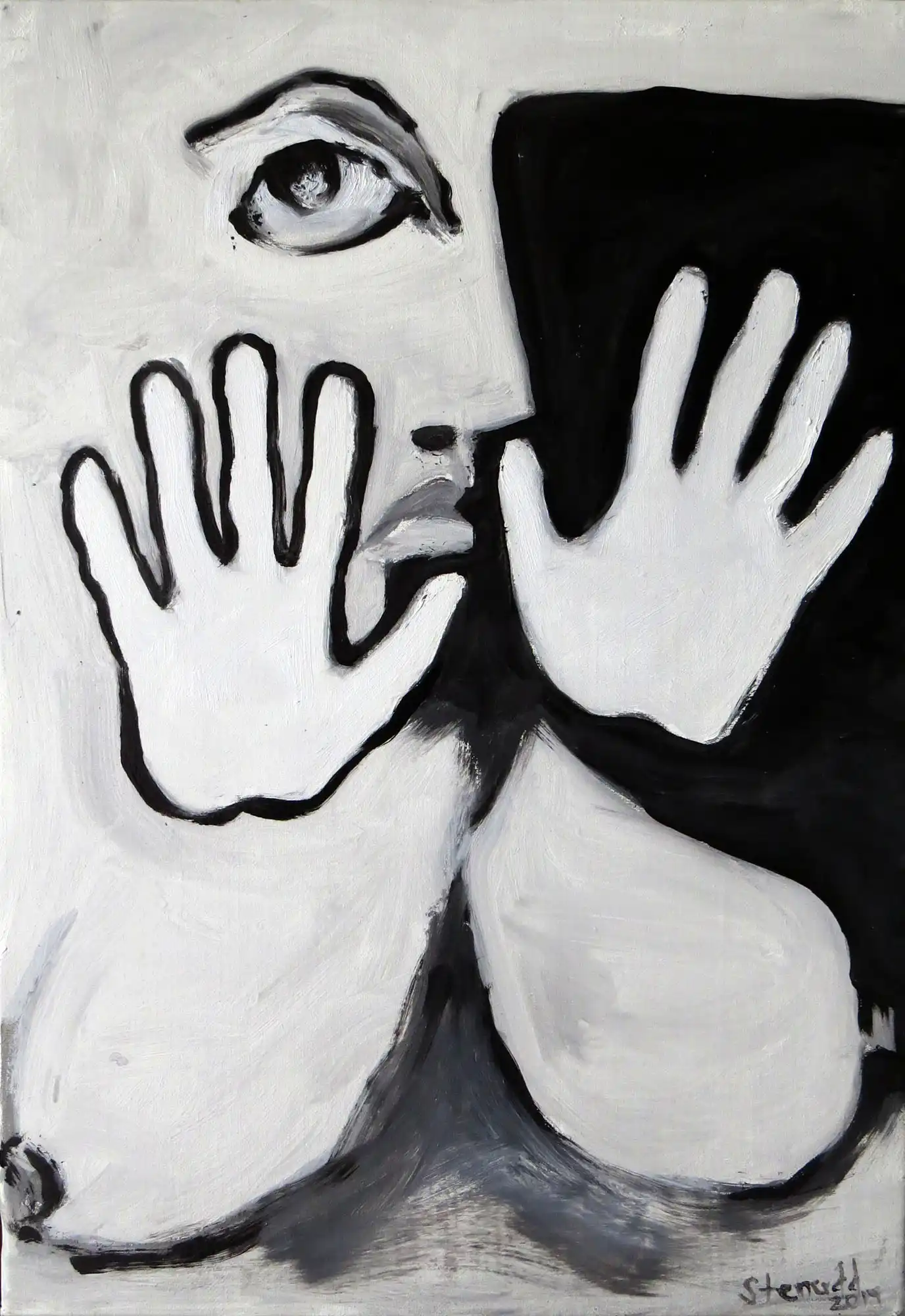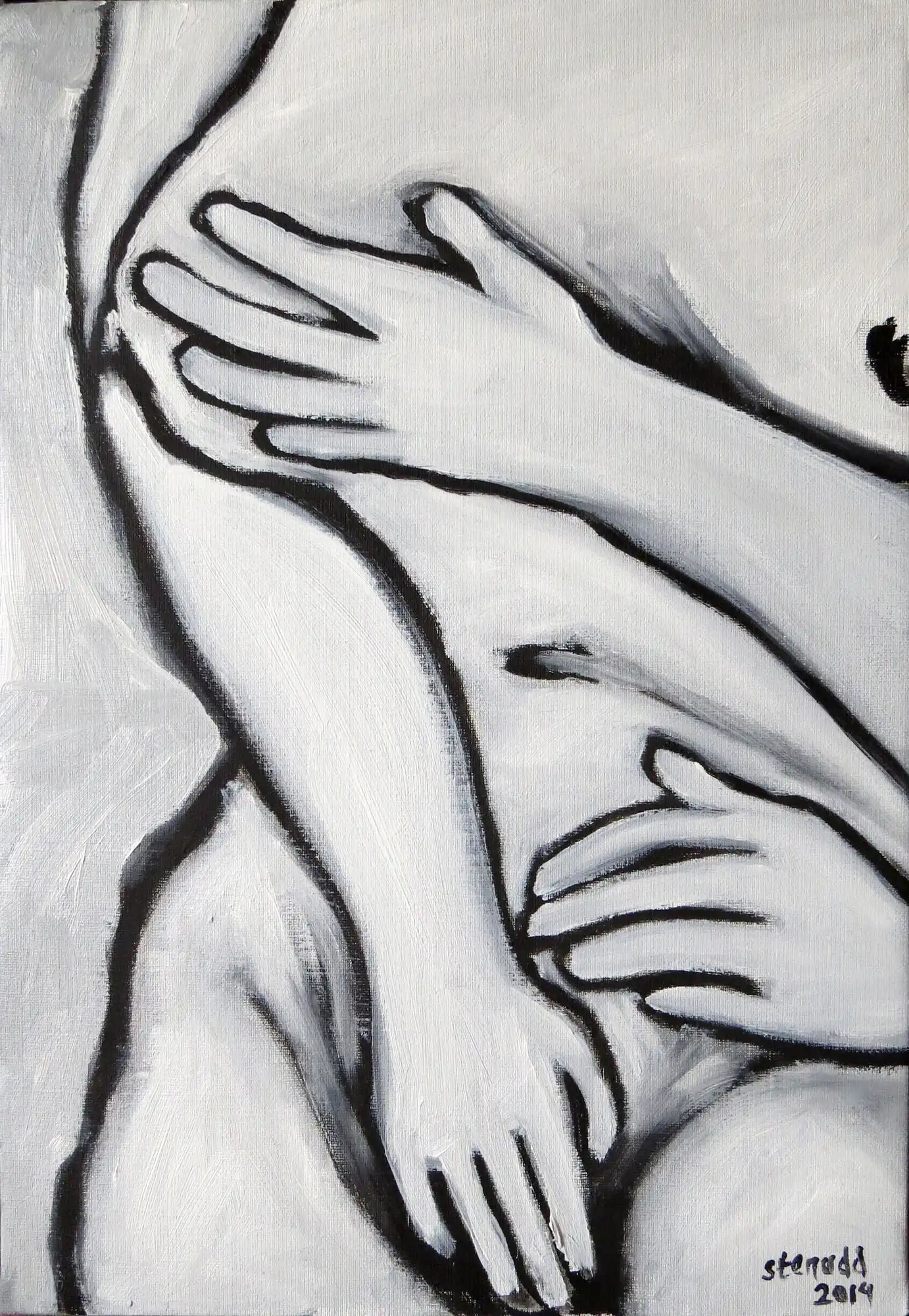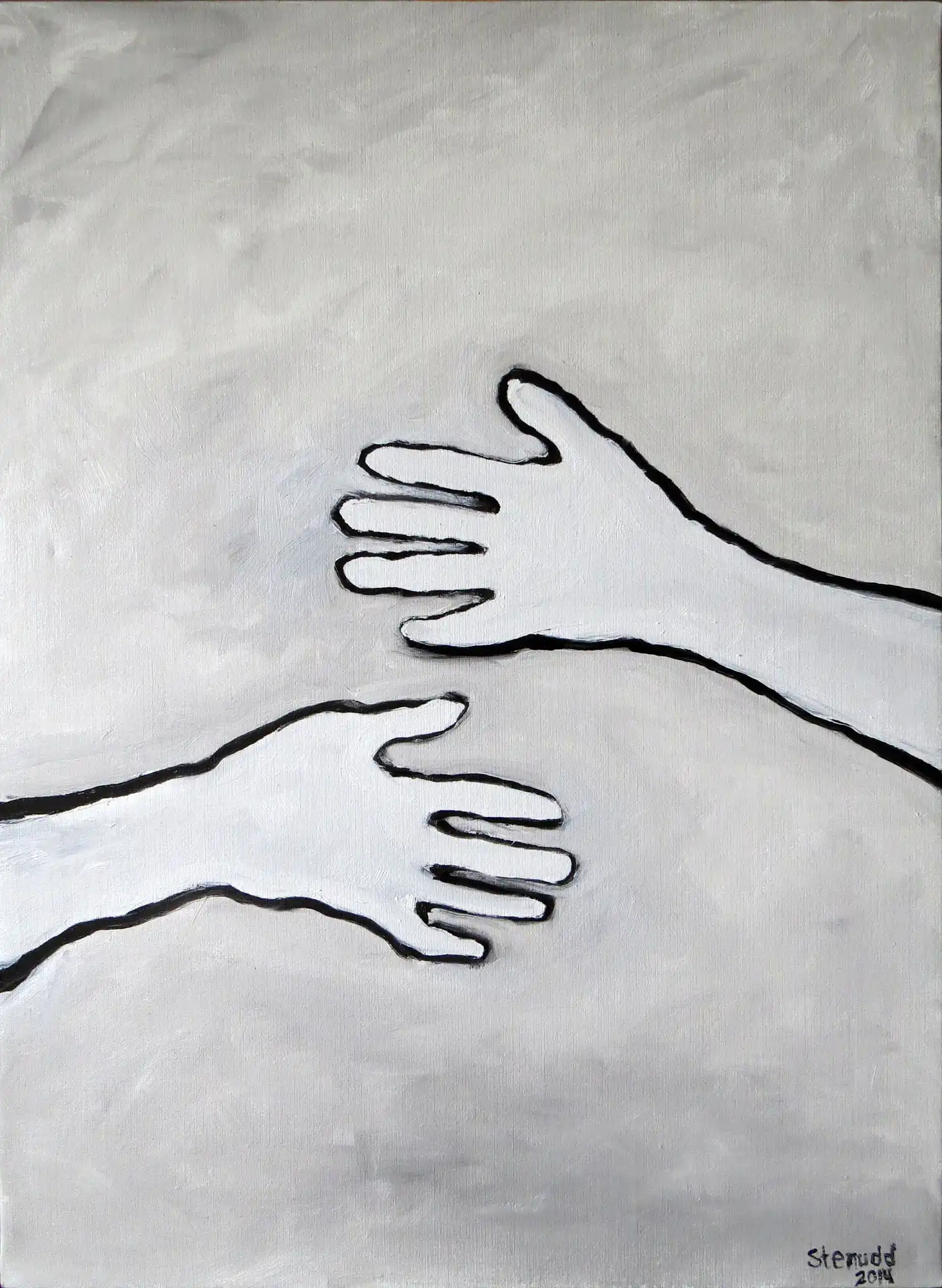 Hands On![]() 2014 Oil Paintings by Stefan StenuddSuddenly I Paint AgainIn July 2014 I picked up the brush and got started, inspired by a local Picasso exhibition, and I got at it with a frenzy. More than one painting per day. We will see how long I keep it up, but so far it's a pure joy. I experiment with black and white well, one black and two different whites. I keep it close to drawing, just to see what happens. It's also kind of a warm up. Colors will come, surely. I call these paintings Hands On, for obvious reasons. On an impulse, I traced my own hand on the canvas, and one idea was followed by another. I've already deviated a bit from this theme, as you can see further down this webpage. The hands remain, but they are not alone.