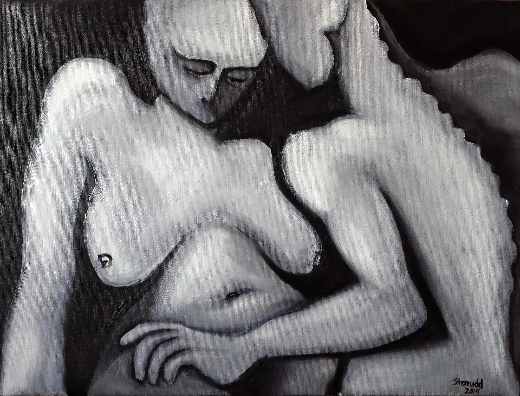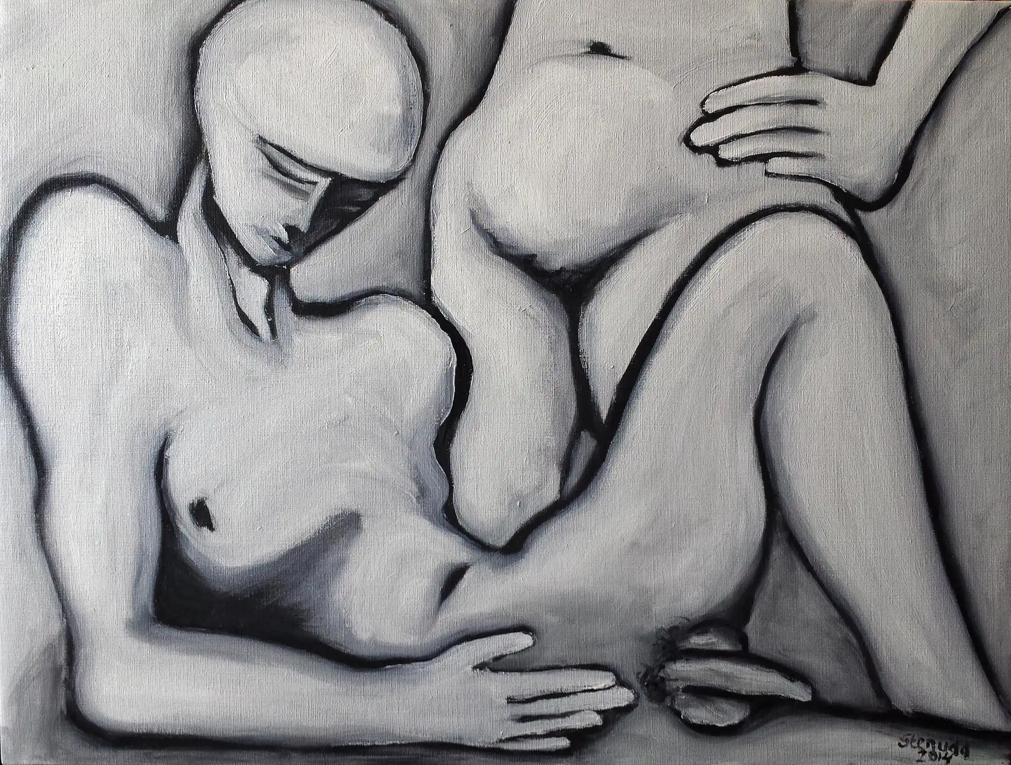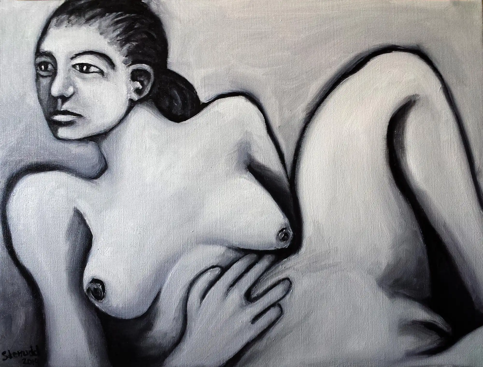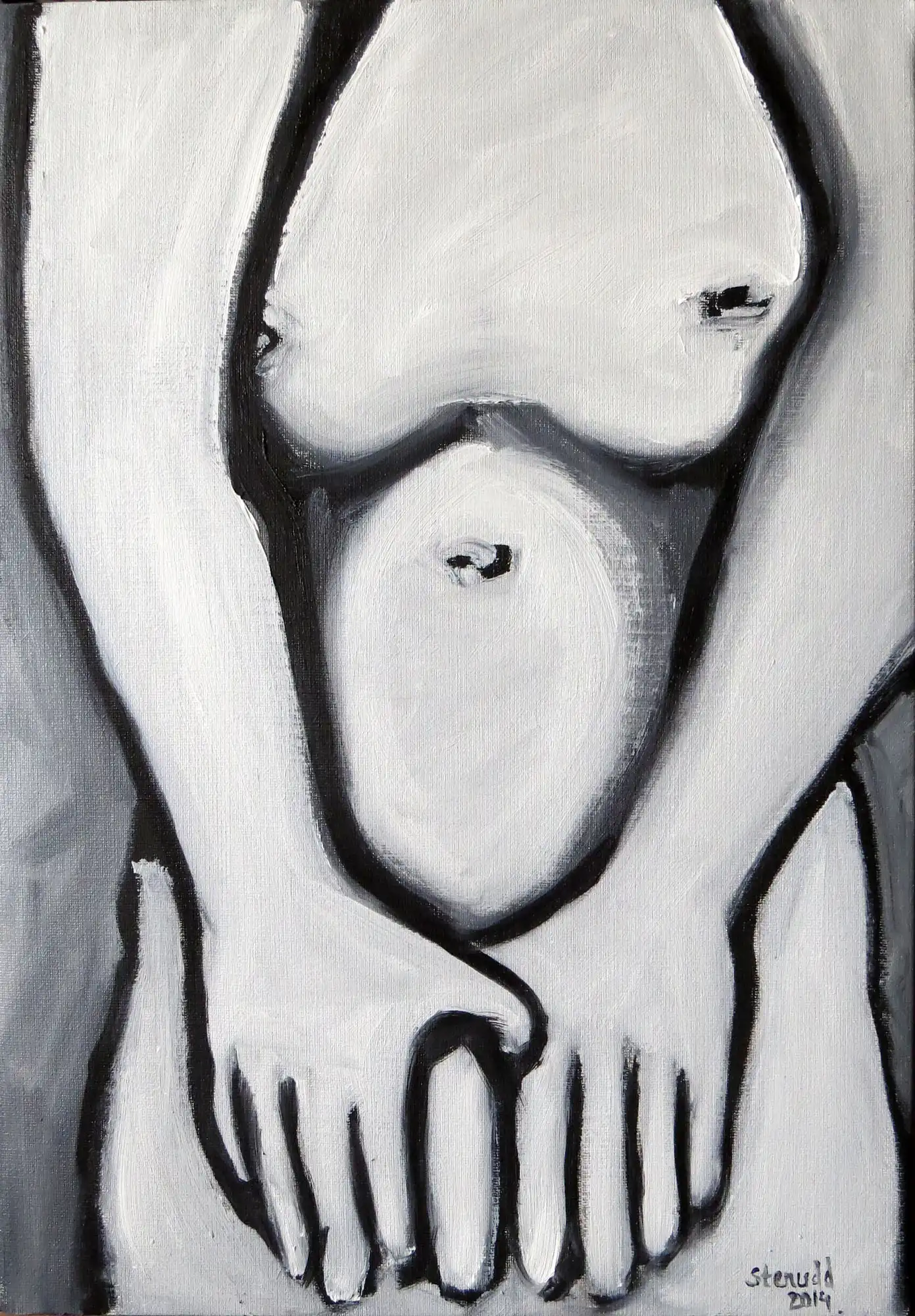 Hands On BodiesMoving on, I added bodies to the hands. It seemed like a natural step...The first painting below is actually how the hands thing started. I made it before the paintings above. That's how I got the idea. It's followed by three versions of the same pose well, almost the same. I tend to work a lot on the charcoal sketch I begin with, but at a certain point it's time for the oil, just to get it done. Then a new canvas to continue to explore the motif some more. The third one felt like some kind of completion. The following oil paintings in this series play some more on the hands on bodies theme. Like the series above, the below paintings are also done with three colors only: black and two whites (zinc and titanium). I don't feel the need for more colors, just yet.