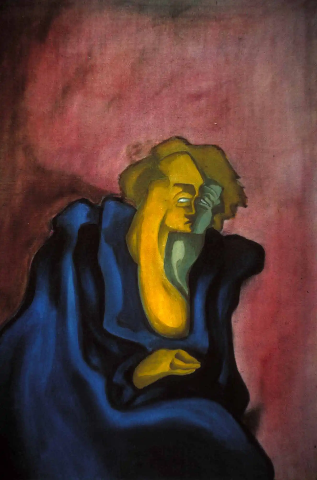 There is a dream world, a kind of foggy concept of reality, that I observe in this and other paintings of the period. This seated person, contemplating, while his face seems to signal a soul breaking into two, reappeared more or less in many of my pictures. The face being a dramatic landscape, where the two halves of it are lovers wrestling, joining or struggling against each other, just as much as ever in a scene of the type in the former painting in that I still firmly believe.